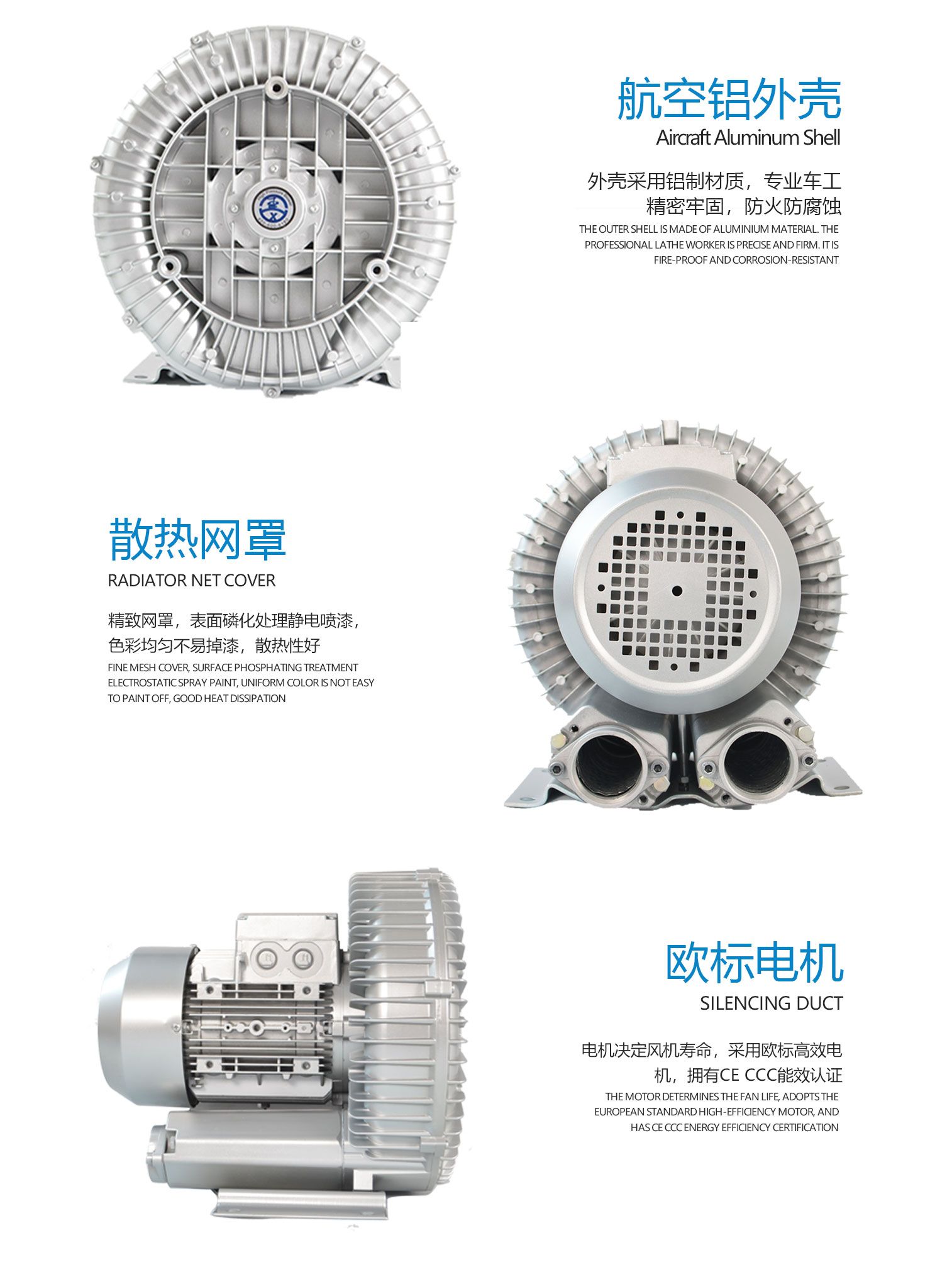 接通电源后,风机旋转,因为叶轮有凹槽设计,会带动空气流动,所以空气通过进风口处进入泵体内,空气在里面搅动,每个凹槽经过漩涡式式的增压,一道一道的循环增压,*终形成强大的气流能量,通过出气口排出泵体外,以供使用。